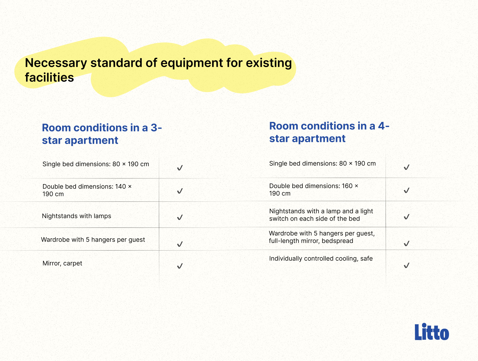 It can be concluded that an apartment in a new building that obtains a three-star categorization is subject to stricter criteria, which are almost comparable to the standards of older properties in higher categories. When comparing the requirements, the differences are relatively small—both between existing and new facilities and between three- and four-star categories. However, owners of new properties must invest additional resources and attention to meet and maintain the prescribed standard.