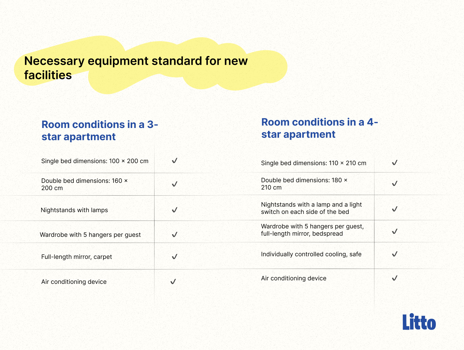 For example, an apartment module with two bedrooms for the 3* category must have at least 59 m² and include two bathrooms. For the 4* category, the same module requires a minimum of 69 m², two bathrooms, and an additional separate toilet.