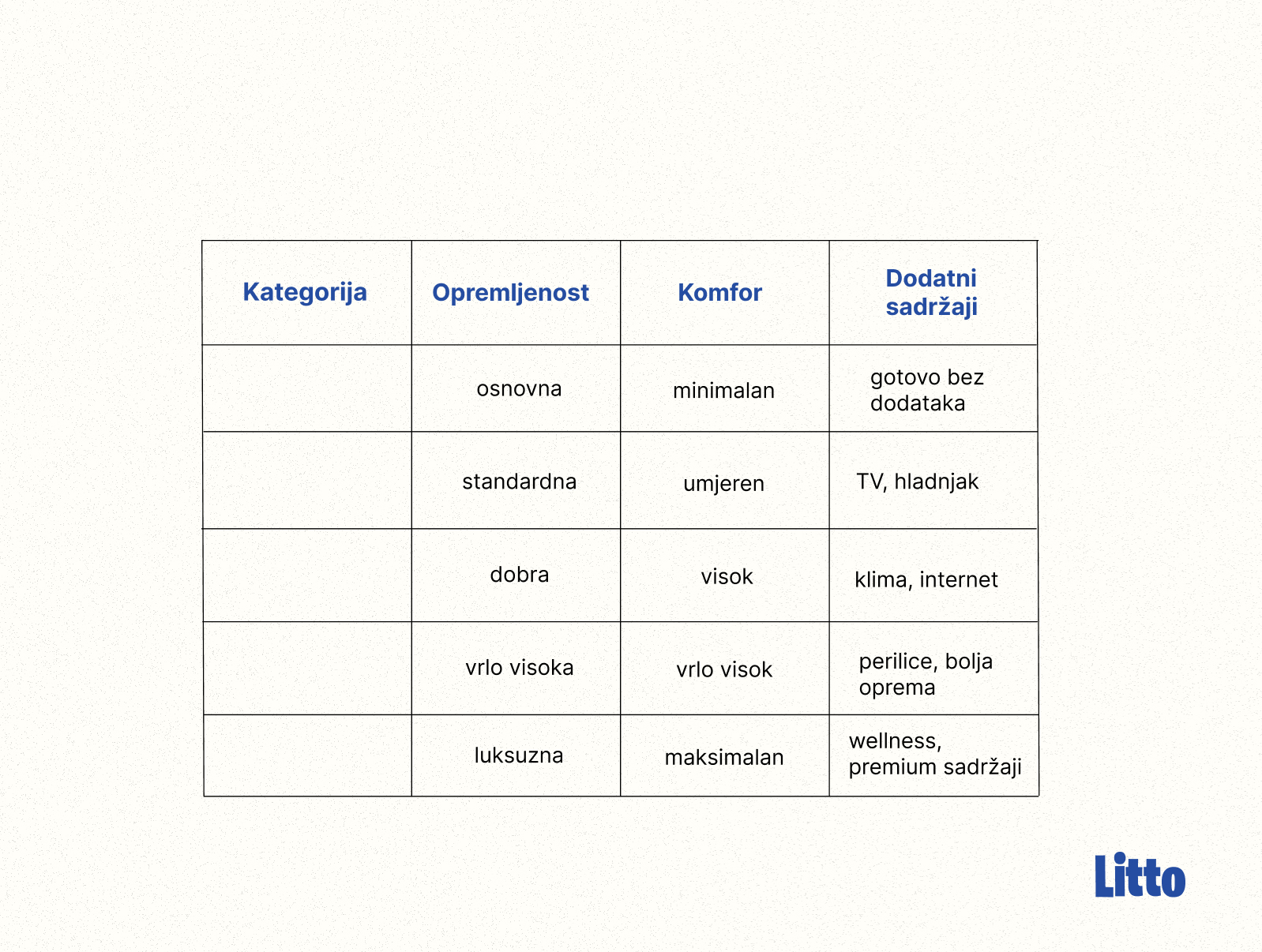 U ovoj sažetoj verziji tablice, prikazan je jednostavan vizualni okvir koji vas navodi i prikazuje što se zahtijeva od različite kategorije s obzirom na opremljenost, komfor i dodatne sadržaje.